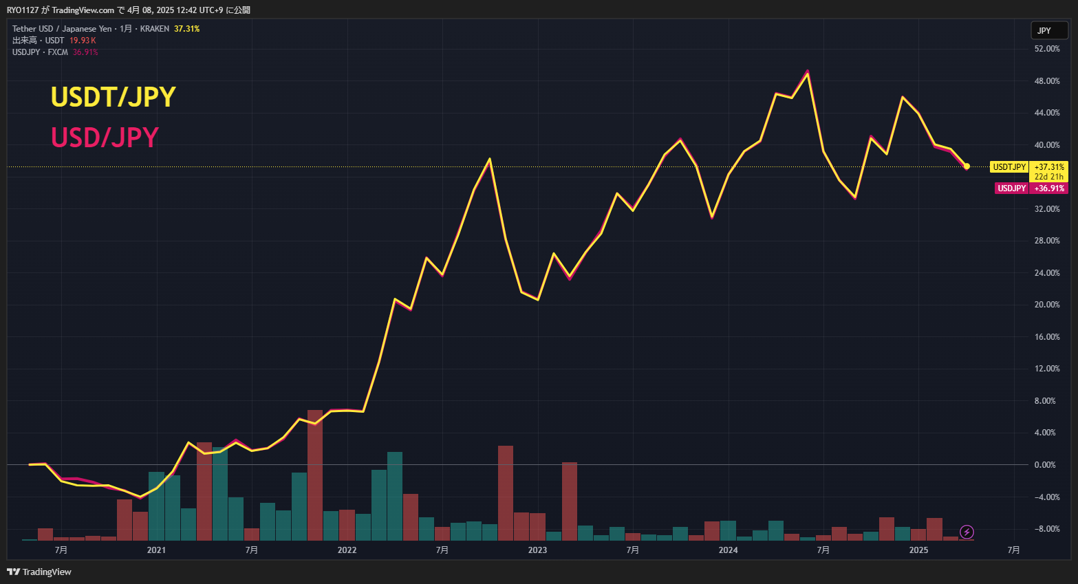 USDTとUSDCは米ドルに連動する暗号資産で、価格の変動幅が小さく、値動きが安定しているのが特徴です。USDTを例に見てみると、米ドルと価格が連動していることが分かります。