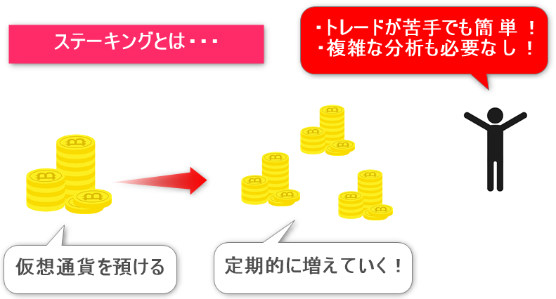 たとえば、特定の仮想通貨を預け入れるだけで報酬がもらえる「ステーキング」もその1つであり、チャート分析などが苦手な方でも効率的に資産を増やすことが可能です。
