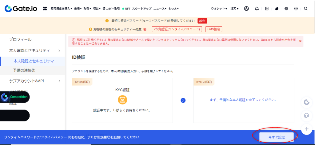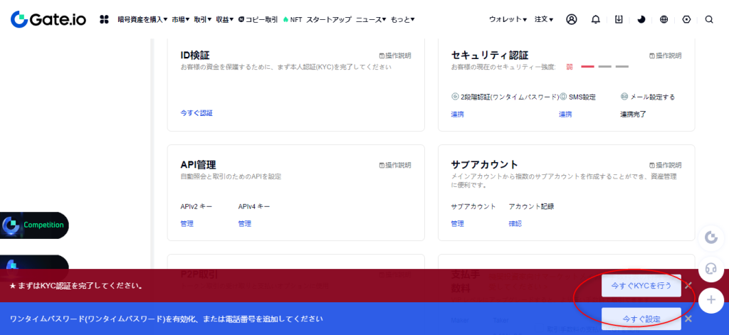 マイページでは「KYC認証」と「ワンタイムパスワード」の設定を促されるため、上から順に手続きしていってください。