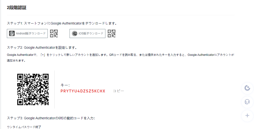 以下画面でiPhoneかandroidの二段階認証アプリをダウンロードし、バーコードを読み込んでから6桁のワンタイムパスワードを入力すれば連携は完了です。