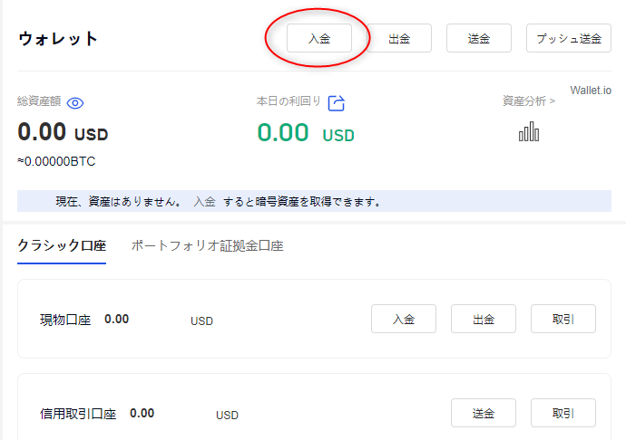 ゲートアイオーの取引口座に入金する際は、マイページの「ウォレット」に表示された「入金」をクリックしてください。