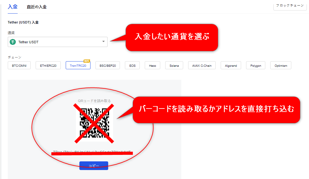 以下画面で「入金したい通貨」を選択した後、バーコードを読み取るか入金用のウォレットアドレスに直接送金すれば完了です。