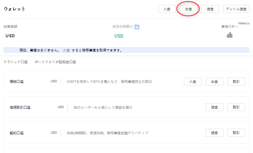 ゲートアイオーの口座にある資金を出金する際は、マイページの「ウォレット」で「出金」に進みます。