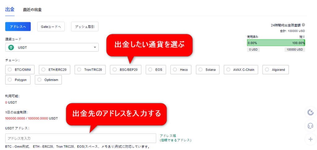 以下画面では、まず「出金したい通貨」と「出金先のアドレス」をそれぞれ設定しましょう。
