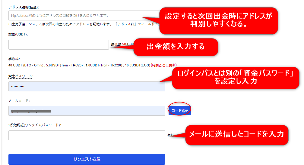 そして、下にスクロールして「出金額」「資金パスワード」「ワンタイムパスワード」を入力すれば出金申請は完了となります。