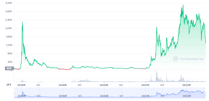仮想通貨市場全体が下落基調となっており、2022年6月現在は最高値水準の半額程度を推移していますが、大暴落も引き起こさず底堅い値動きとなっています。