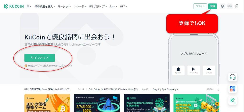 クーコインの口座を開設する際は、まず公式サイトにログインして「サインアップ」をクリックします。