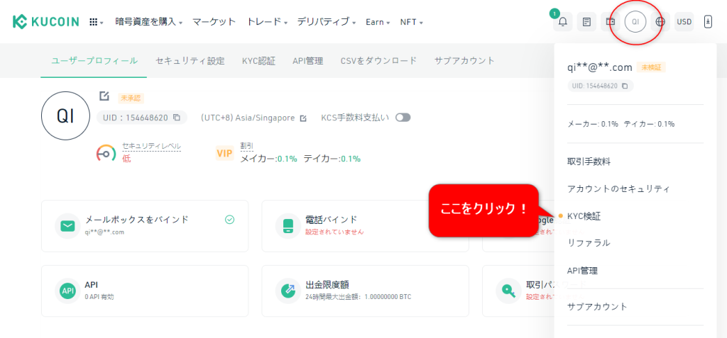 2022年6月現在は、日本人でも問題なく手続きが行えるため、マイページ右上の「QI」から「KYC認証」に進んでください。