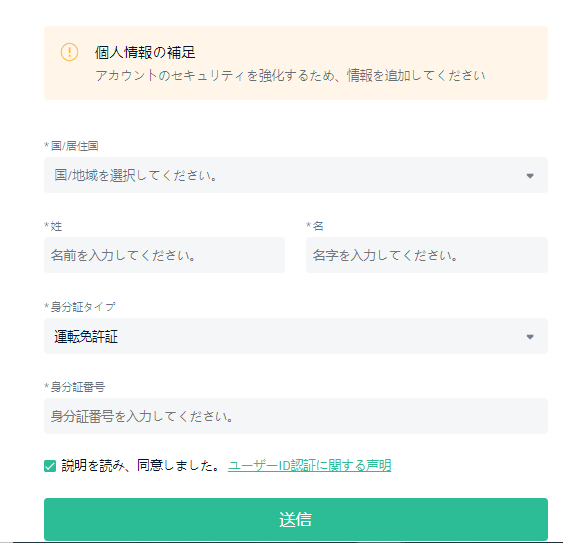 下図で「居住国」「氏名」を入力し、身分証のタイプを設定してから免許書番号などを登録すれば完了です。