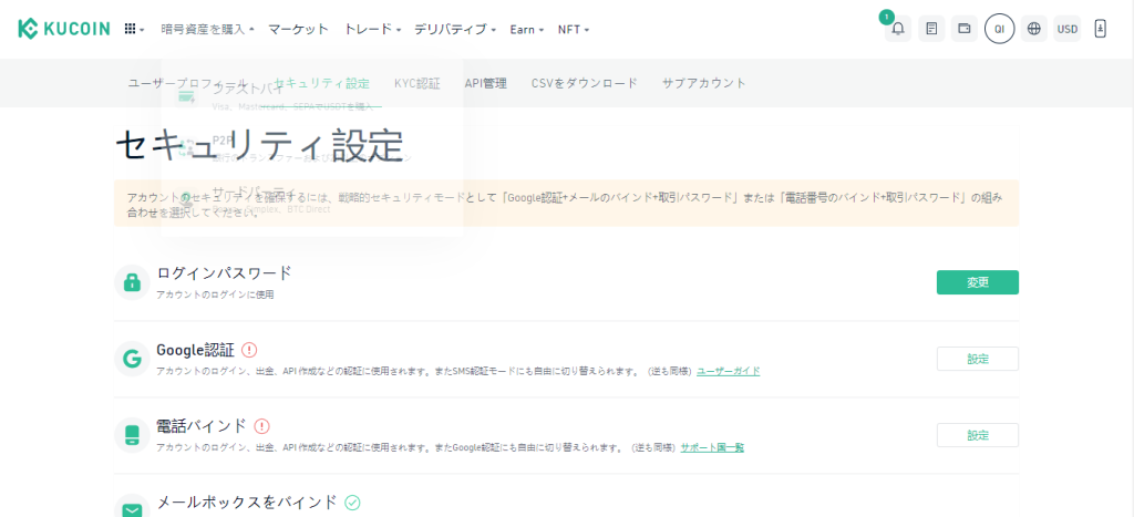 クーコインの取引口座に入金したいときは、まずセキュリティの設定を行わなければなりません。