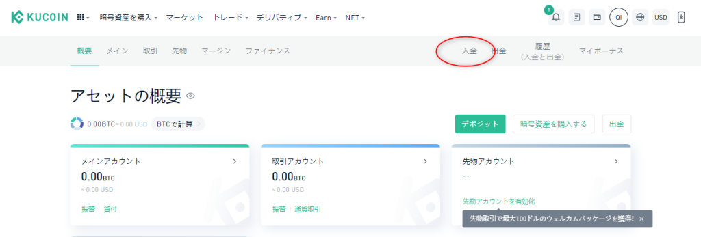 無事に必要なセキュリティ機能が整ったら、マイページ右上の「入金」をクリックしてください。
