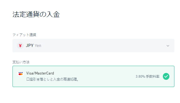 「フィアット通貨=JPY」に選択すれば、自動的にVisaかMasterCardでの支払画面に切り替わりますが、もし該当のブランドを持っていない場合は「暗号資産の入金」を選びましょう。
