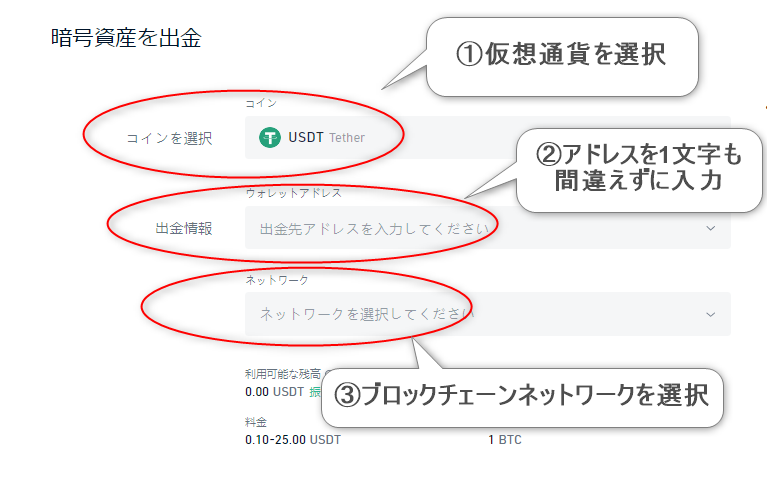 以下画面で送金したい仮想通貨を選び、ウォレットアドレスとネットワークを設定してから送金手続きを行いましょう。