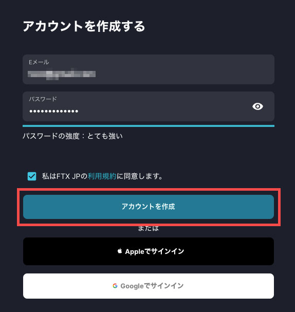 アカウント作成の画面に切り替わりますので、メールアドレスとパスワード、利用規約にチェックを入れて「アカウントを作成」をクリックしてください。