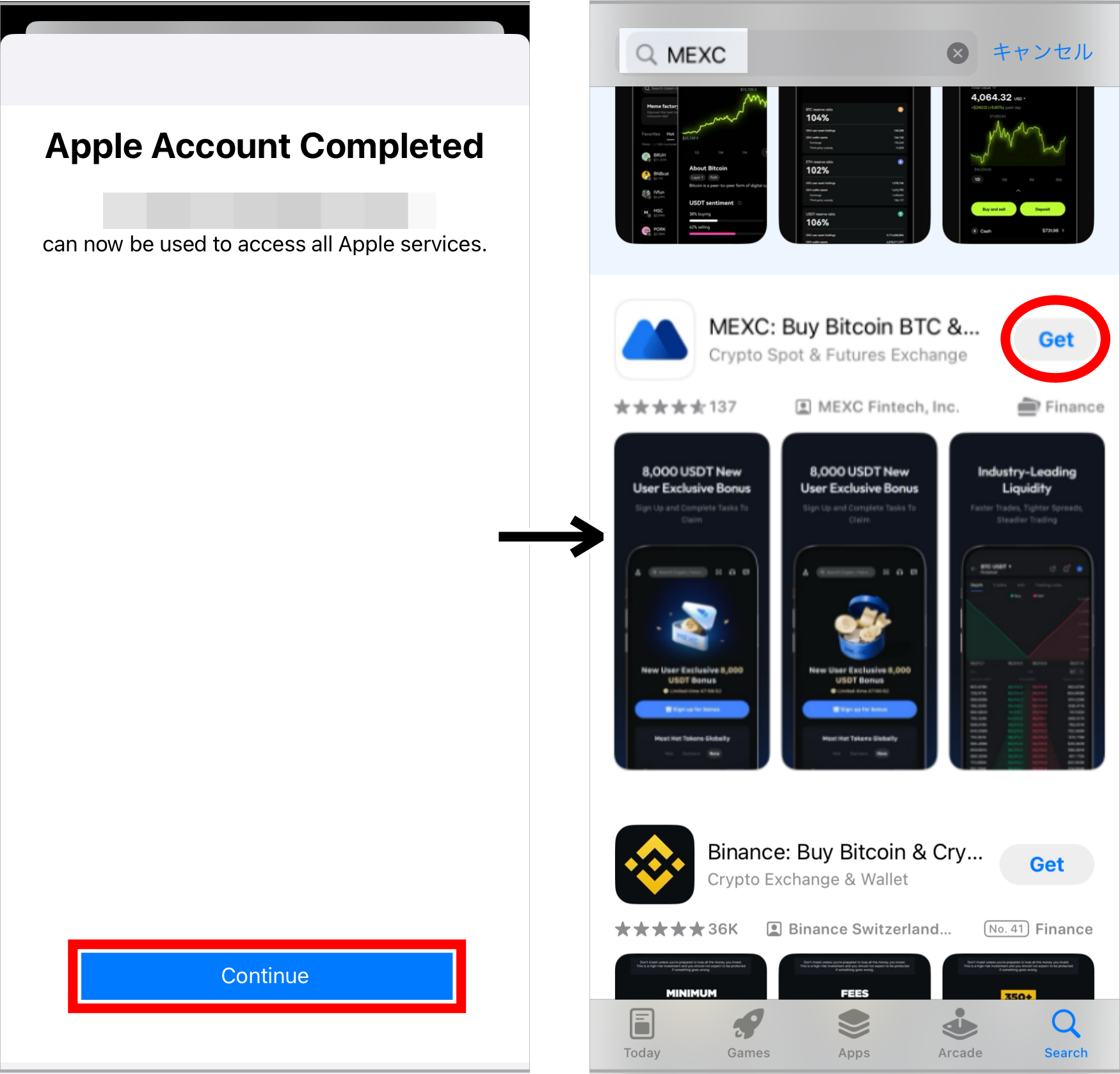 入力を終えたら「Next」をタップします。これでApple Accountの情報入力が完了しました。「Continue」を押して、MEXCのアプリの「Get」を再度タップします。