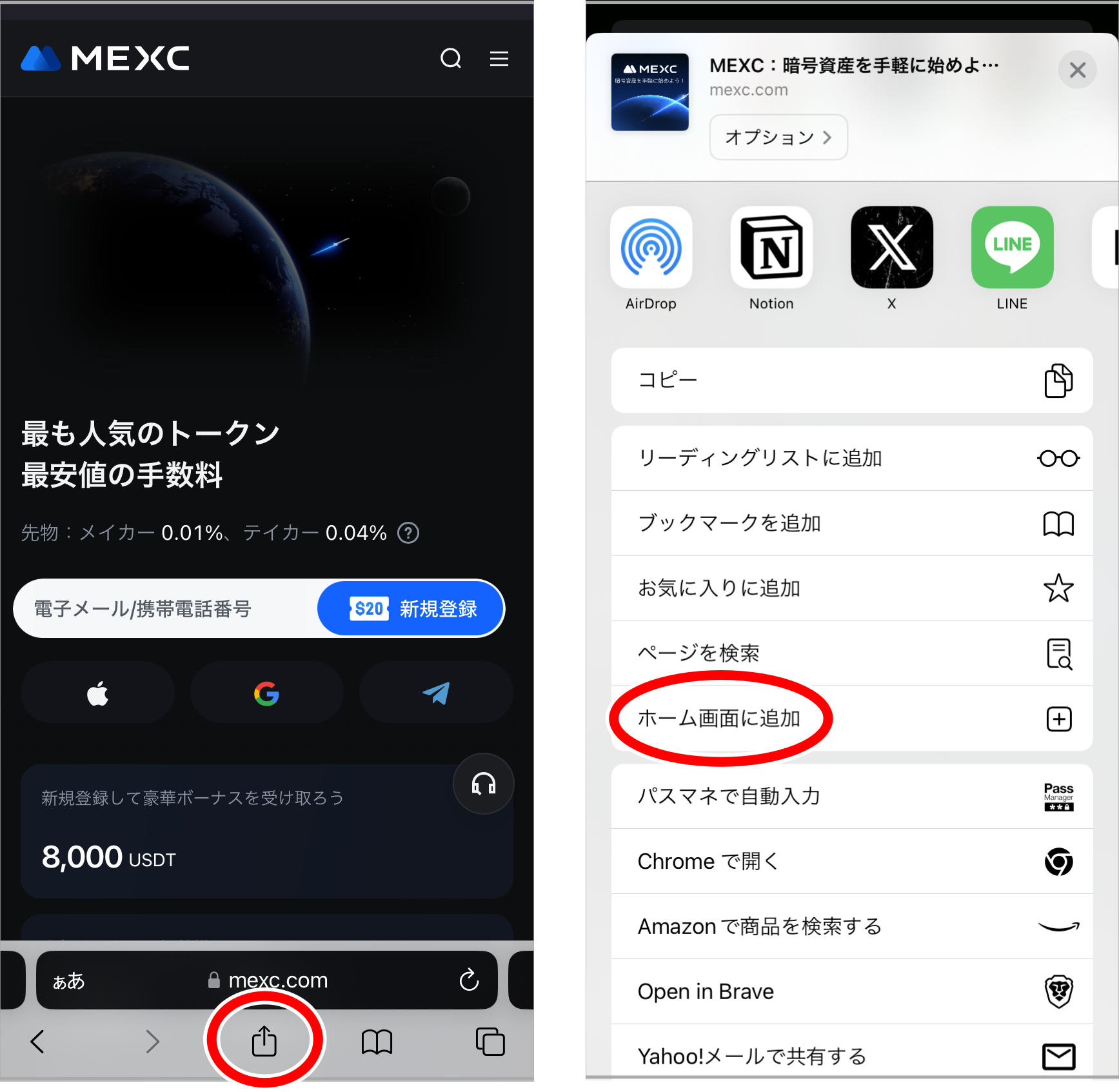 スマホのブラウザ版は、比較的見やすく作られているためこちらを利用してもいいかもしれません。その場合は、ブラウザでMEXCにアクセスした後に、画面真ん中のアイコンをタップ。「ホーム画面に追加」を選択します。
