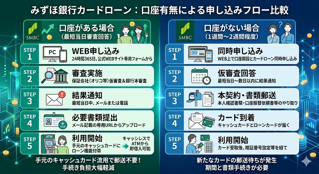 みずほ銀行カードローンの審査スピードを引き出すためには、申し込みから融資実行までのフローを正確に把握しておく必要があります。特に「みずほ銀行の普通預金口座」の有無によって、手続きの煩雑さと所要時間が大きく変化する点は、全ての申込者が留意すべき重要事項です。