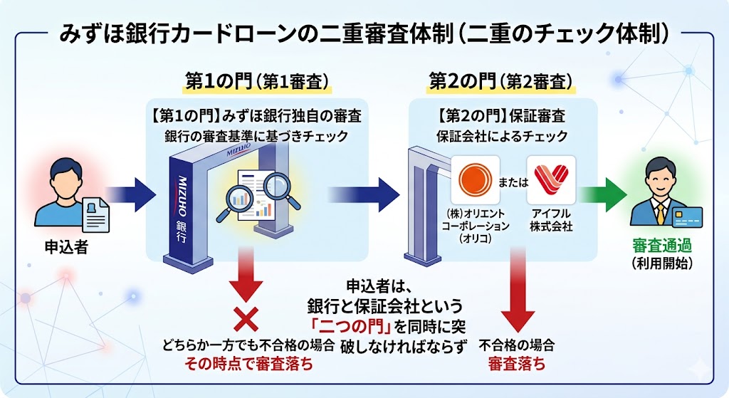 審査の厳しさを裏付ける大きな要因が、保証会社による「二重のチェック体制」です。みずほ銀行カードローンでは、銀行自身の審査に加えて、株式会社オリエントコーポレーション(オリコ)またはアイフル株式会社による保証審査が行われます。