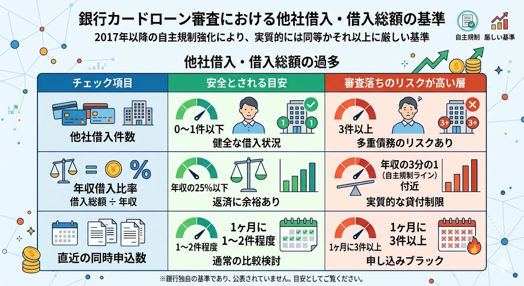 銀行カードローンは消費者金融のような「総量規制(年収の3分の1までの貸付制限)」の直接的な対象ではありませんが、2017年以降の自主規制強化により、実質的には同等かそれ以上に厳しい基準が設けられています。