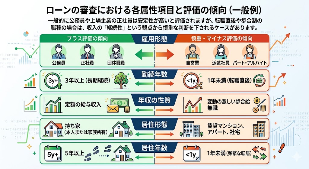 一般的に公務員や上場企業の正社員は安定性が高いと評価されますが、転職直後や歩合制の職種の場合は、収入の「継続性」という観点から慎重な判断を下されるケースがあります。