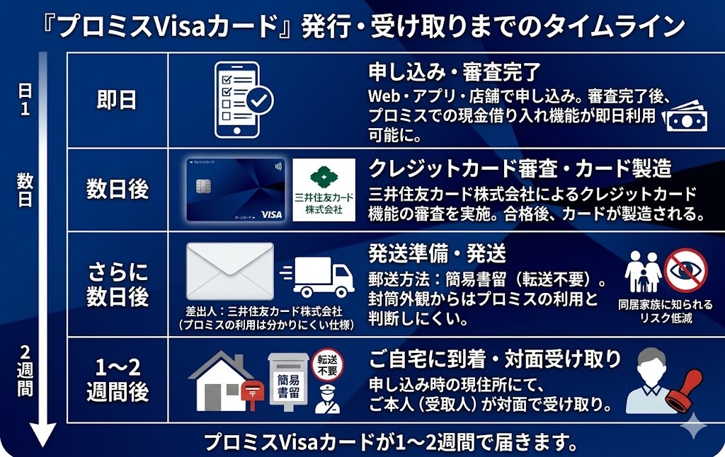 現金を調達したあとは落ち着いてカードの到着を待ちましょう。後日、三井住友カード側でクレジットカード発行の審査が行われ、通過すれば約1〜2週間後に自宅へ簡易書留(差出人:三井住友カード株式会社)でプロミスVisaカードの現物が届きます。