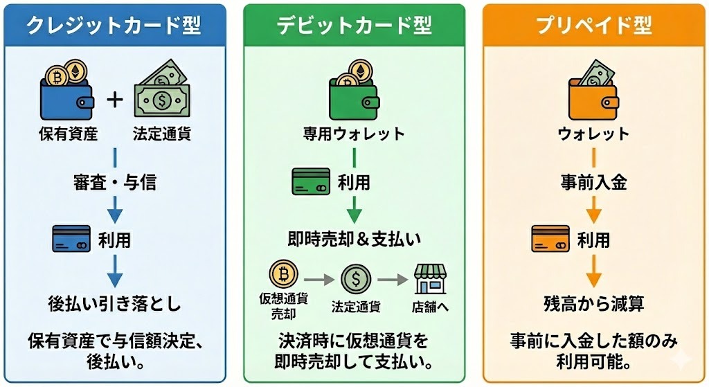 クリプトカードには大きく3つの種類があり、決済のタイミングやシェアが異なります。