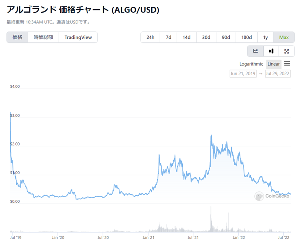 アルゴランド(ALGO)がリリースされた2019年からのチャートは、以下の画像のとおりです。