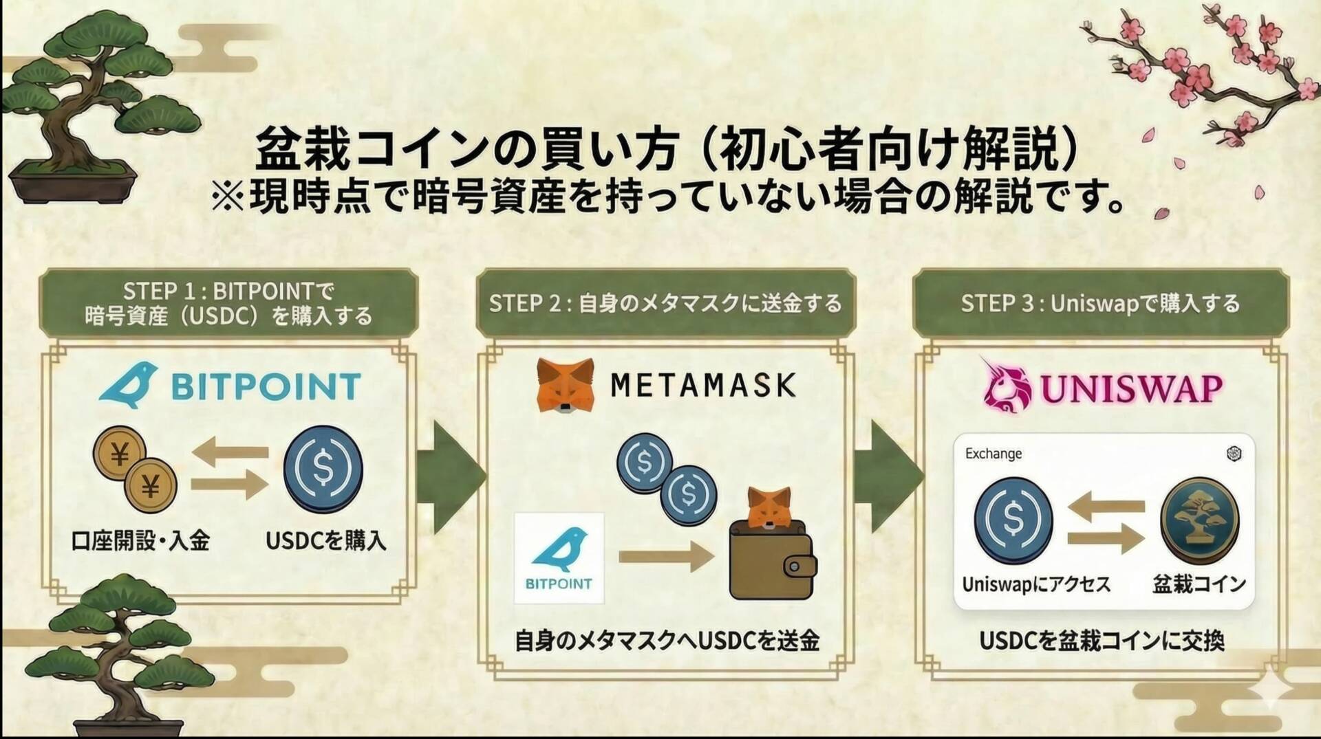 暗号資産は余裕資金での購入が基本です。盆栽文化やコミュニティが好きで、自分のペースで関わりたいケースでの購入は相性がよい一方で、短期の値幅取りだけを目的とするとリスクが大きくなります。長期目線で無理なく楽しめる範囲で始めるのが安全です。
