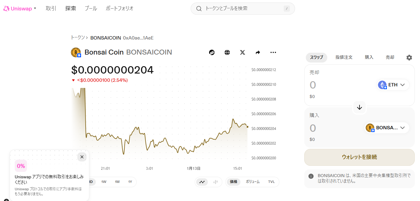 CoinGeckoのデータを見ると、BONSAICOINのFDVは約1600万ドル規模のタイミングがあり、出来高は日によっては数十ドルレベルまで落ちることがあります。流動性はBaseチェーンのUniswap V3に存在しますが、流動性プールは常に十分とは限りません。