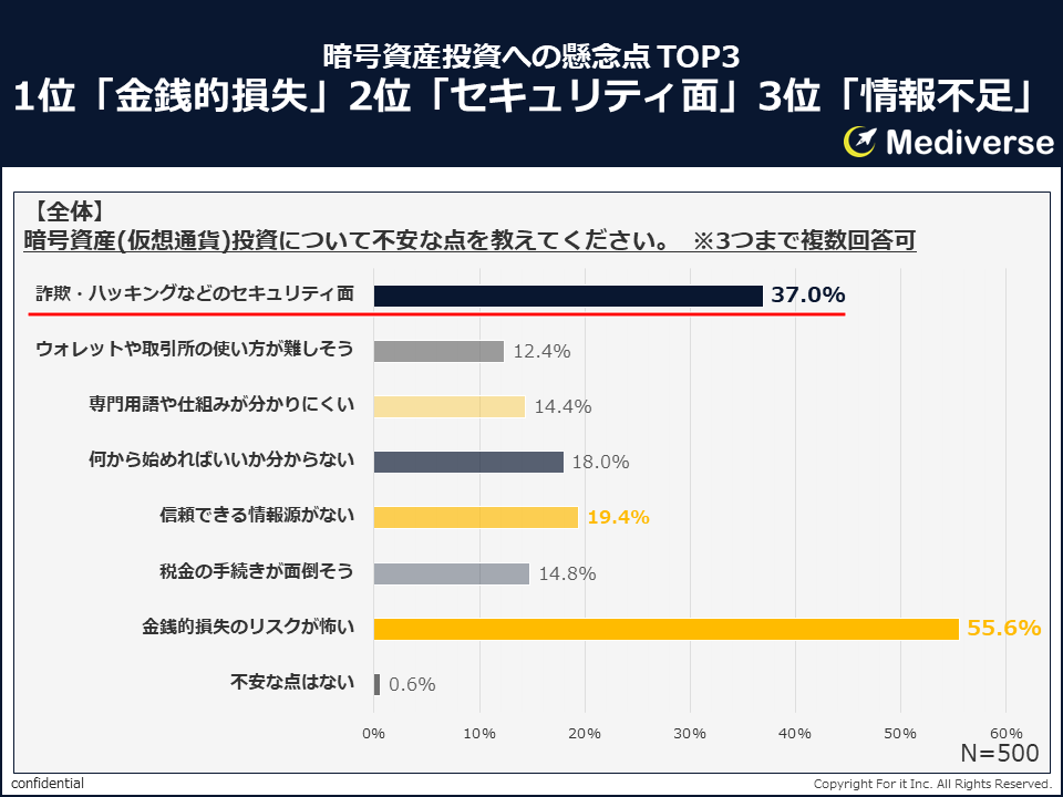 当サイトが独自に取ったアンケートでも、37%の回答者が「詐欺・ハッキングなどのセキュリティ面」を大きな不安要素として挙げています。