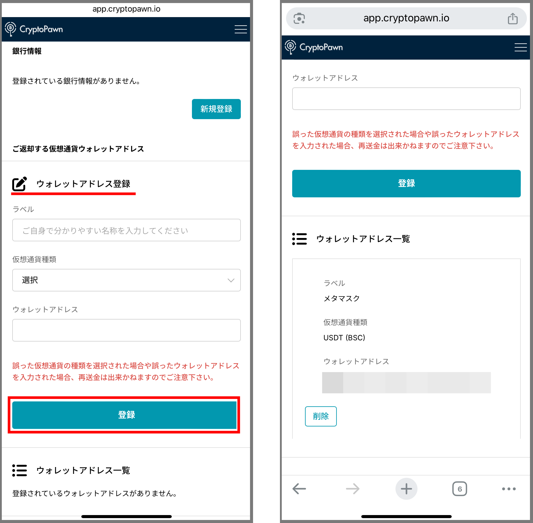 また借り入れた現金を返済したときには、預け入れていた暗号資産が返ってくるウォレットアドレスでもあります。間違えずに登録をしておきましょう。