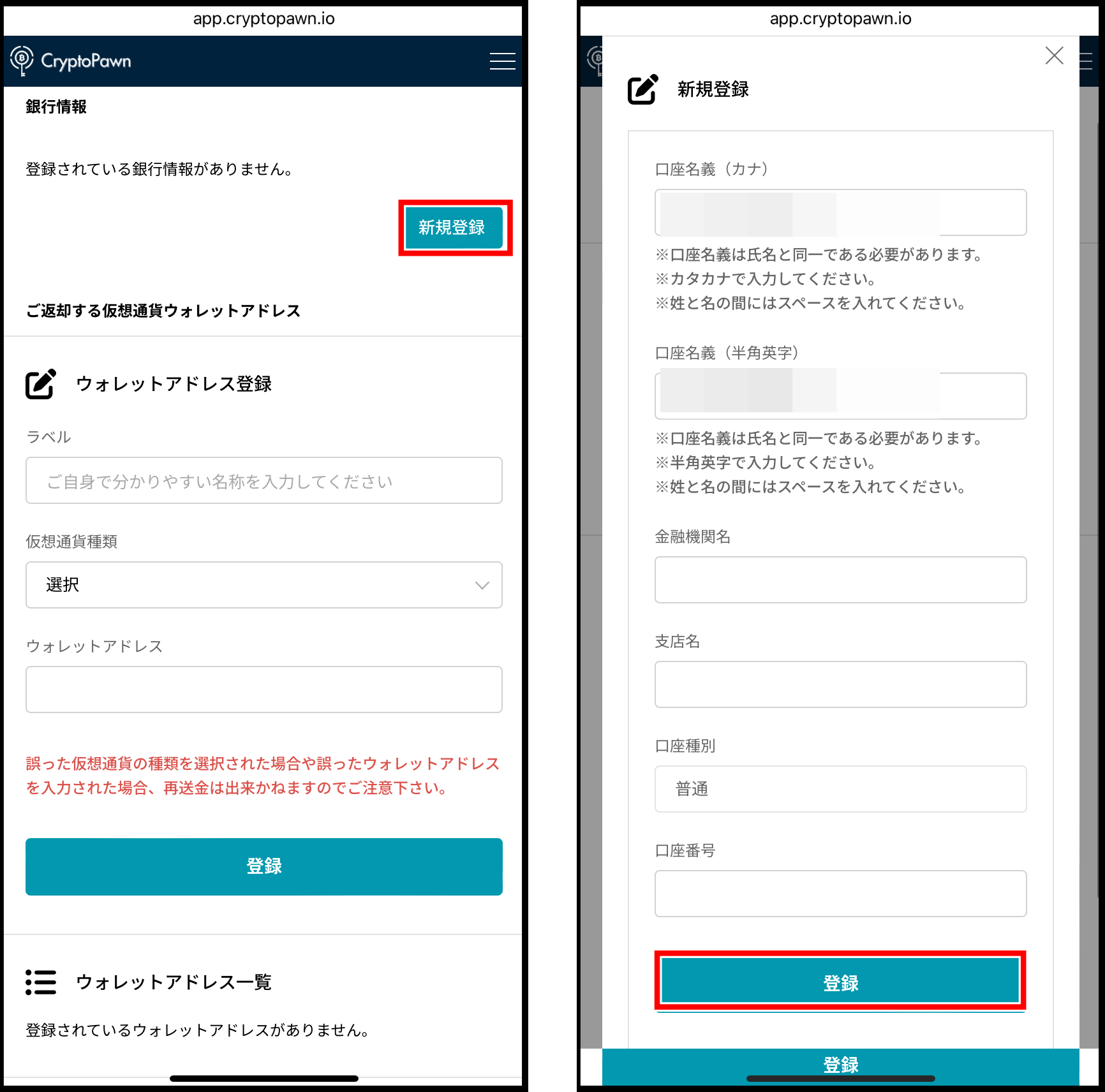 銀行口座情報は、CryptoPawnから日本円を受け取る際に利用されます。