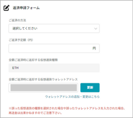 - 全額ご返済時に返却する仮想通貨ウォレットアドレス:登録しておいたウォレットアドレスを選択
