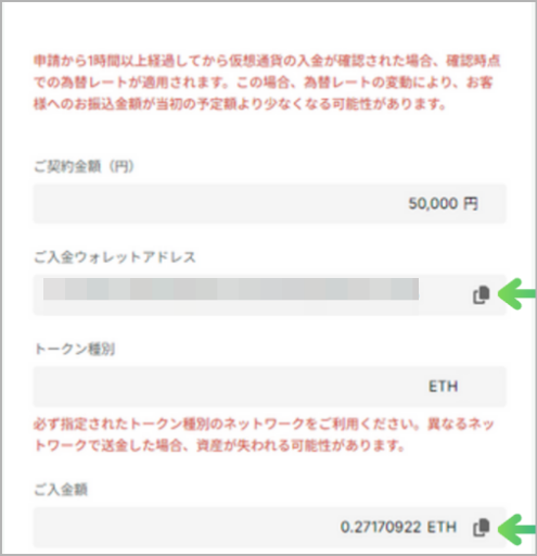 注意点として、「入金する仮想通貨の種類」と「ウォレットアドレス」はよく確認しておきましょう。
