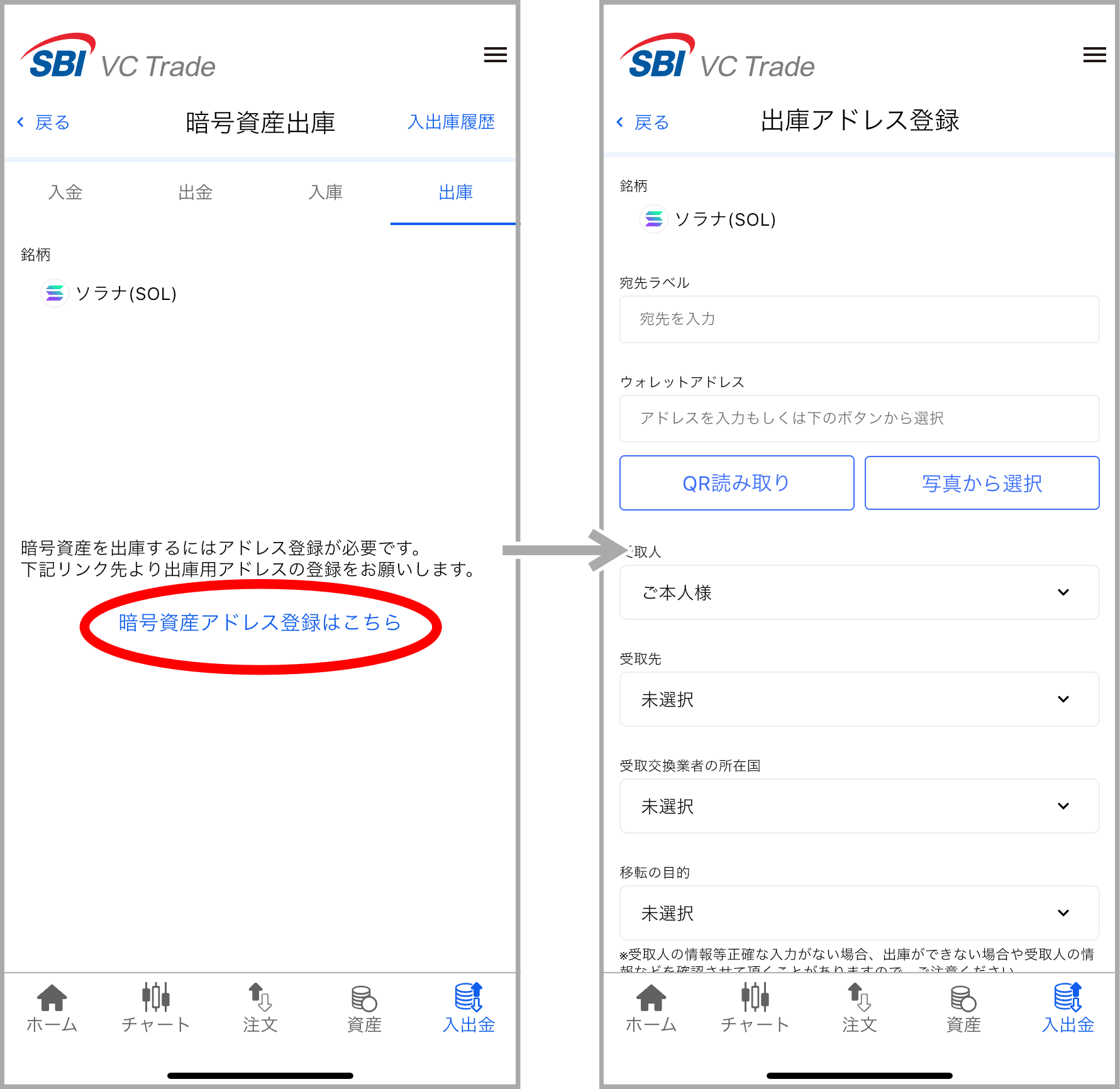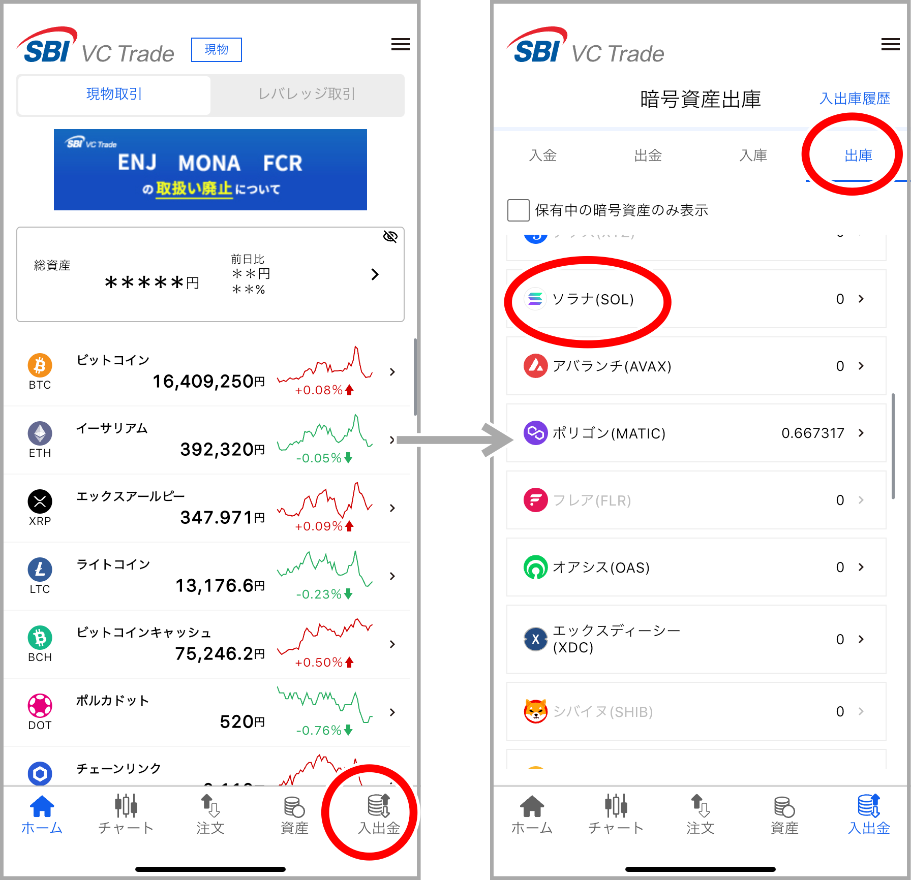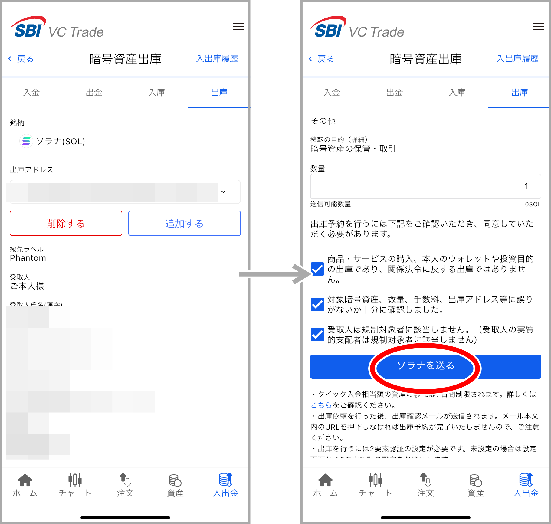 SBI VCトレードからPhantomに暗号資産を出金(送金)する手順は以下の通り。