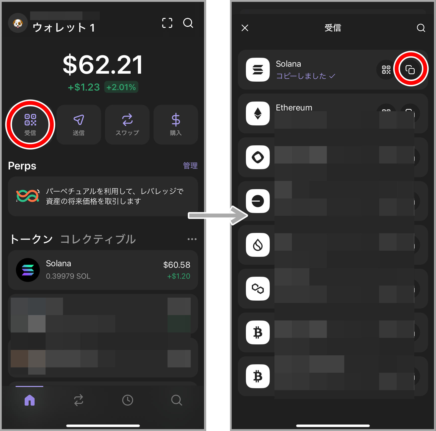 Phantomにログインしたら「受信→Solanaのアドレス」を表示させます。