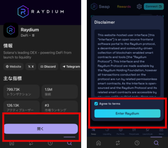「Raydium」と検索すると、「暗号資産銘柄(トークン)のRaydium」と「WEBサイトのRaydium」の両方が出てきます。サイトの方をタップすると、以下の画面になります。