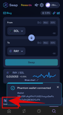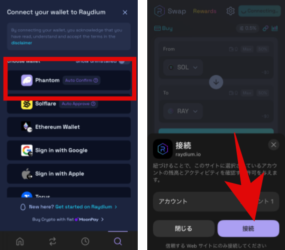 注意点として、Phantomアプリ内のブラウザでRaydiumを開いてください。通常のGoogle chromeやsafariなどで開くと接続が切れて、取引が失敗するおそれがあります。