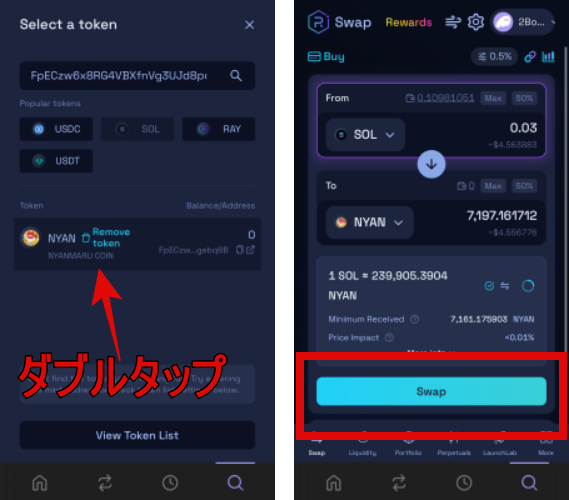 次にNYANを取り扱っているDEX(分散型取引所)のRaydiumを開きます。同じくSolana系DEXのJupitarでも購入できますが、今回は例としてRaydiumの画面で説明します。