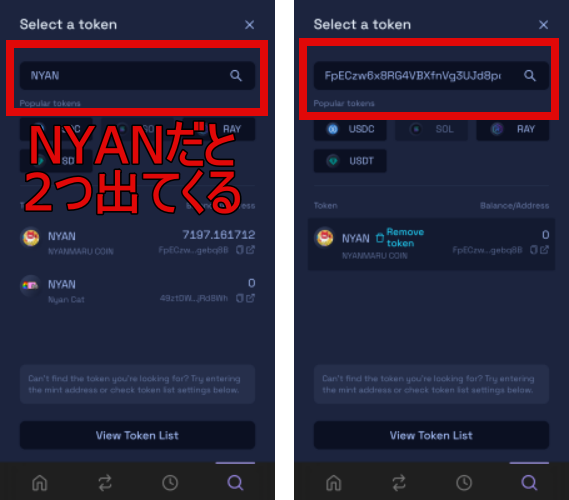 「NYAN」というティッカーシンボル(BTCなどの略称)を持つコインは2つあり、誤った方を購入するリスクがあるからです。コントラクトアドレスは偽造ができないので、唯一信じられる存在です。