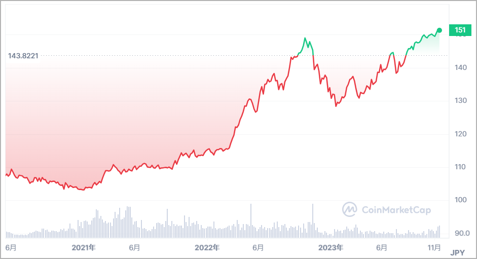 USDTとUSDCは米ドルに連動する暗号資産で、価格の変動幅が小さく、値動きが安定しているのが特徴です。USDTを例に見てみると、米ドルと価格が連動していることが分かります。
