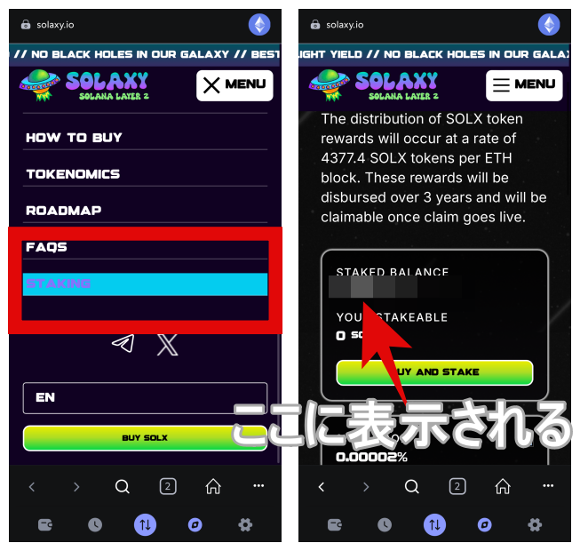 ソラクシー上でメタマスクと接続したうえで、右上の「MENU」→「STAKING」へ進むと、現在保有しているSOLX量が表示されます。ここで確認できれば一安心です。