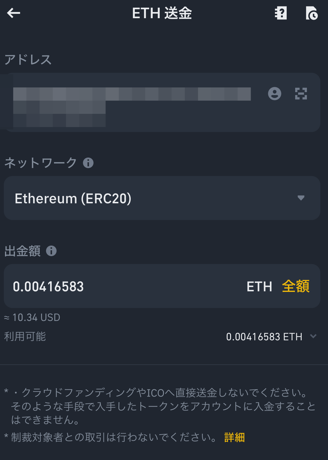「ETH 全額」として、「出金」をタップしてください。