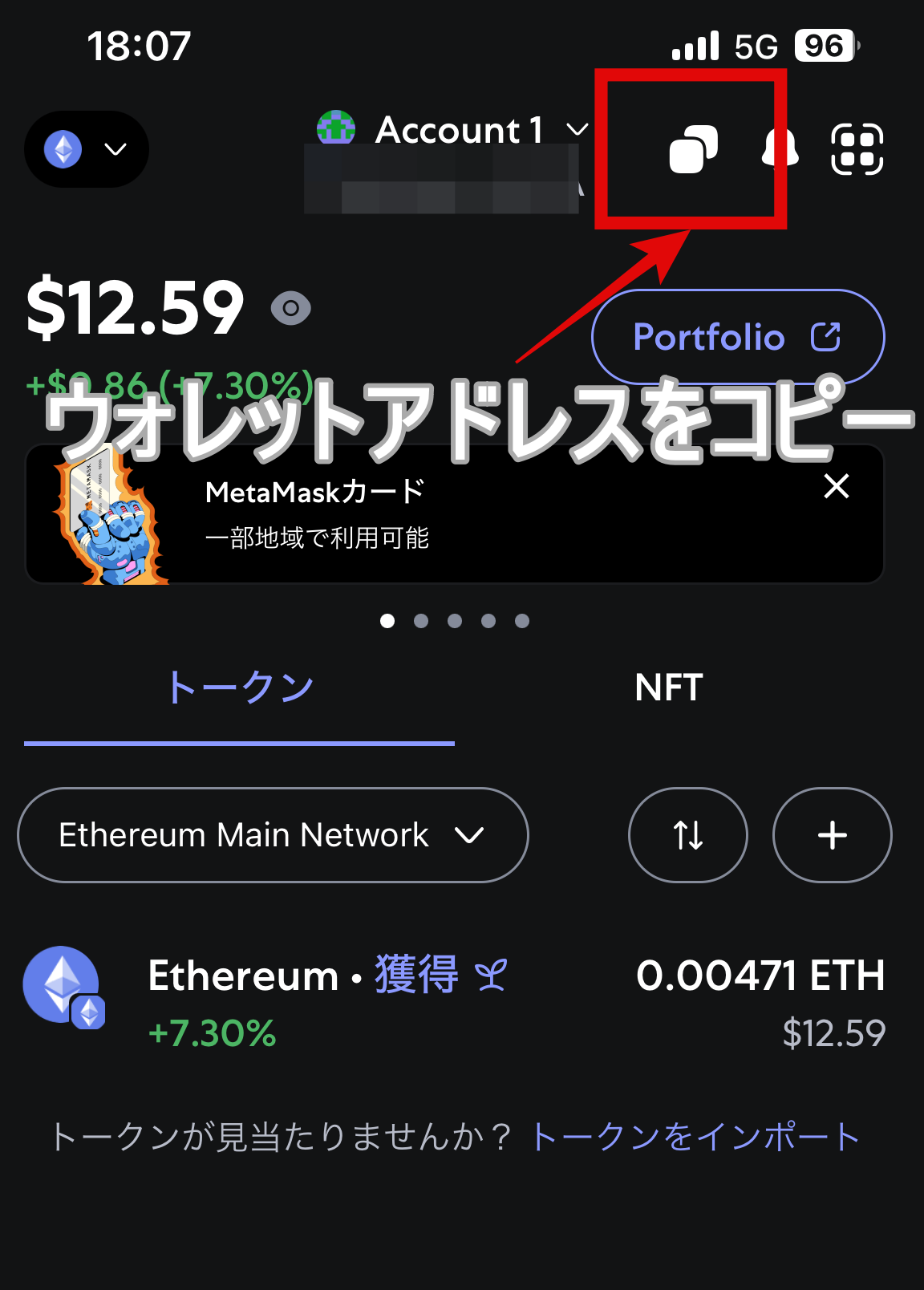 上部真ん中にあるアドレスがウォレットアドレスであり、その横のボタンをタップするとアドレスがコピーされます。