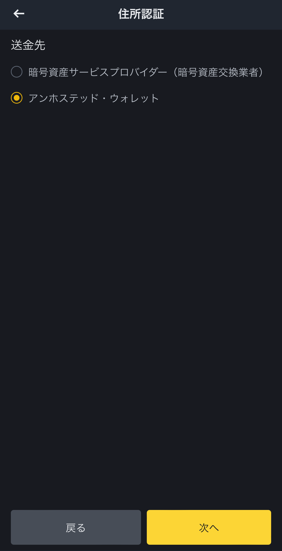 その後、住所確認(アドレス認証)が続きます。送金先は「アンホステッド・ウォレット」にしてください