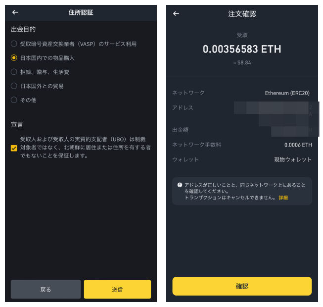私は「日本国内での物品購入」にしました。そして送金情報を確認して、「確認」を複数回タップすれば出金処理が始まります。