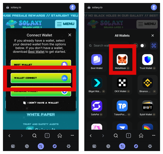 「WALLET CONEECT」→ご自身のウォレットを選択(私はメタマスクを使っています。)→「接続」をタップ。