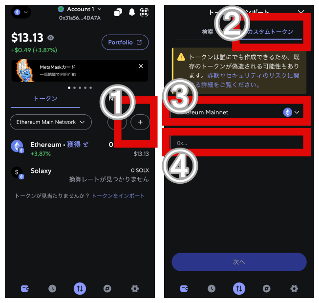 まず①の「+」をタップしてSOLXを探します。そして②で「カスタムトークン」に切り替え、③で「Ethereum Mainnet」を入力し、④にソラクシーのコントラクトアドレスを入力してください。