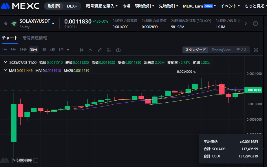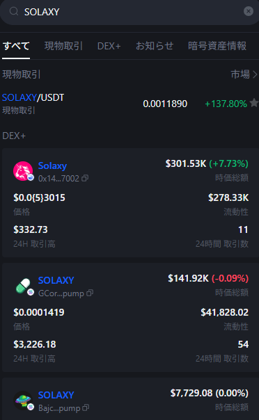 MEXCでのティッカー表示は「SOLAXY」ですが、公式サイトとUniswapで購入した「SOLX」と同じものです。単にティッカーが違うだけのものなので、その点心配は不要です。