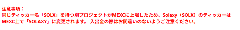 MEXCに上場はしましたが、公式サイトやUniswapで購入した時とティッカーが変わっています。当初は「SOLX」でしたが、MEXCでは「SOLAXY」にティッカーシンボルが変更されています。「すでにSOLXというティッカーのコインがあったから」と説明されていますが、混乱を招く可能性があります。